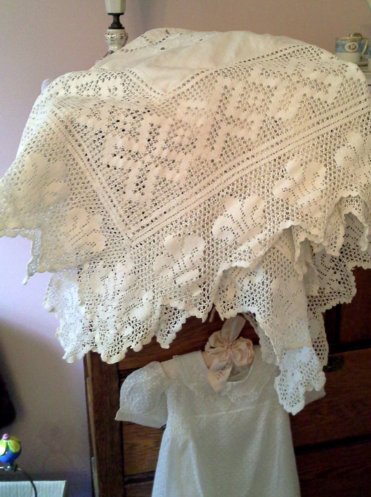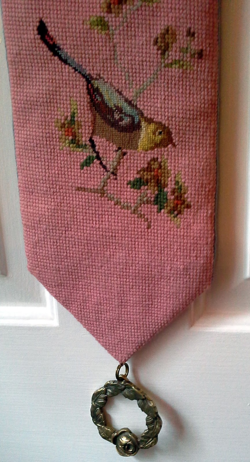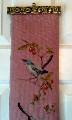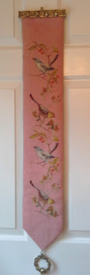 I never bid on on-line auctions but last week I decided to try it. The lot I bid on was pictured as an open drawer with several nondescript pieces of linen hanging out of it. I won with an $8 bid. Much to my surprise, when I went to pick up my winnings it was a large box of linens. About half of it I couldn't use but two of the prettiest items were this beautiful tablecloth and a needlepoint bell pull.