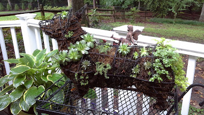 My corgi topiary has flourished with all the rain. I have had it five years. A sweet blogging friend (Angela) from WVA sent me succulents to plant in it when I first purchased it. For the most part, I have to replace the plants each year except the hens and chickens.